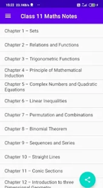 Aplikasi ini mencakup berbagai bab penting seperti Pengantar Geometri Tiga Dimensi, Fungsi Trigonometri, dan Teorema Binomial, di antara lainnya. Setiap bab dilengkapi dengan penjelasan yang mendalam untuk membantu siswa memahami materi dengan lebih baik. Dengan antarmuka yang ramah pengguna, Class 11 Maths Notes memberikan aksesibilitas yang baik bagi siswa yang ingin belajar dan berlatih Matematika dengan cara yang menyenangkan.